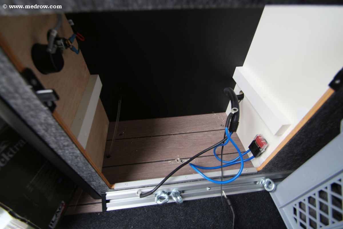 Am Boden befestigt ist die Batterie mit drei Aluwinkeln, die mit Schrauben in Gewindehülsen im Boden befestigt sind.